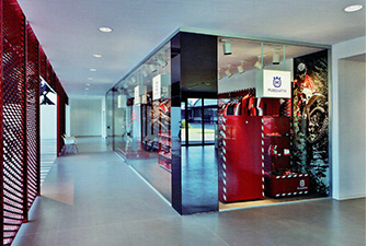 在Husqvarna摩托車總部,寶馬集團決定委任Buratti+Battiston建筑設計團隊來設計他們的新展廳。新建筑坐落在街道的一旁,用兩層高的全透明的玻璃墻打造。議會室、專賣店、摩托車的陳列室也可兼作老式摩托車的展覽廳。這個展廳主要是以紅色網格狀的金屬材質打造,使展廳被一層一層的“面”包裹著,遠觀會留給人留下非常深刻的印象。